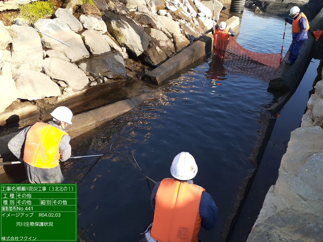 その作業の際、水生生物の死滅を防ぐために締切内の生物を保護し下流へ放流しました。